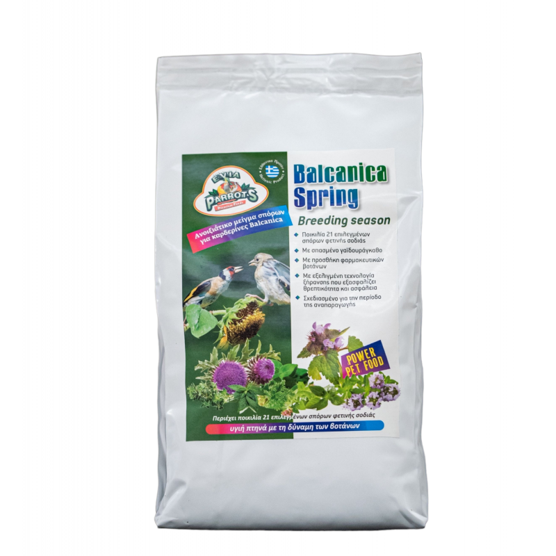 Ανοιξιάτικο μείγμα για καρδερίνες Balcanica με 21 σπόρους και προσθήκη φαρμακευτικών βοτάνων. Σχεδιασμένο σε συνεργασία με διακεκριμένους εκτροφείς βακανικής καρδερίνας. Υψηλής ποιότητας ενεργειακό μίγμα για καρδερίνες Balcanica, από σπόρους φετινής σοδιάς, επεξεργασμένους με εξελιγμένη τεχνολογία ξήρανσης.