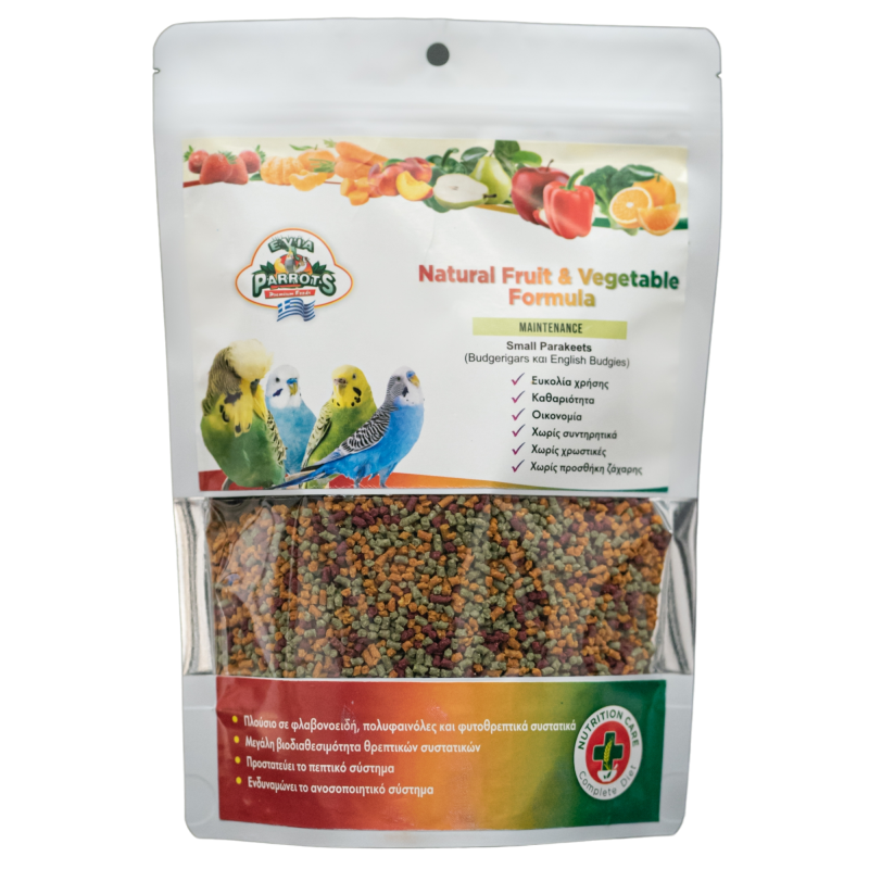 Η Natural Fruit and Vegetable Formula Μaintenance, είναι μια πλήρης σχηματοποιημένη τροφή (pellets) της σειράς Complete Diet της Evia Parrots. Είναι ιδανική για περίοδο συντήρησης για μικρά παπαγαλάκια (Budgies και English Budgies) όπως Budgerigars και English Budgies.