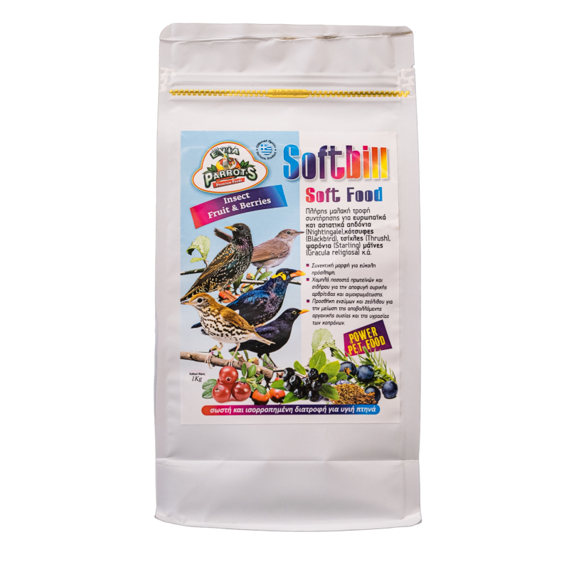 Η Evia Parrots Softbill (Soft Food), είναι μια υψηλής ποιότητας μαλακή τροφή, ειδικά σχεδιασμένη για μαλακόραμφα πτηνά (Softbill), που τρέφονται με έντομα, φρούτα και καρπούς του δάσους, όπως ευρωπαϊκά και ασιατικά αηδόνια (Nightingale), κότσυφες (Blackbird), τσίχλες (Thrush), ψαρόνια (Starling) μάϊνες (Gracula religiosa) κ.ά. Η Evia Parrots Softbill (Soft Food), έχει συνεκτική μορφή που δημιουργεί σβόλους και διευκολύνει την πρόσληψη, καθώς τα είδη των «μαλακόραμφων» πτηνών καταπίνουν την τροφή τους.