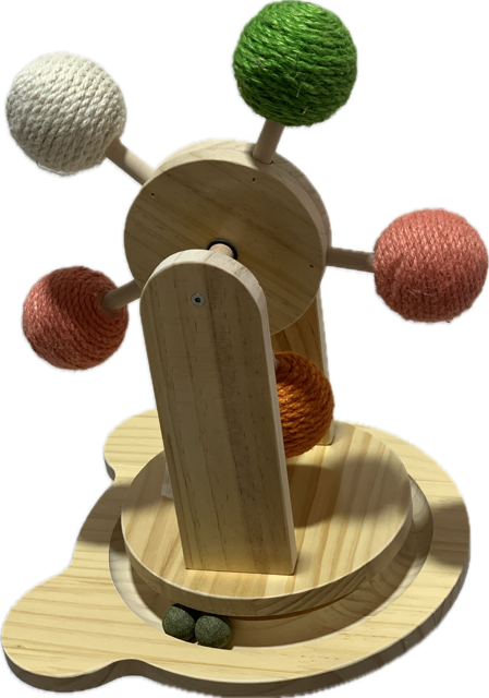 Κατασκευασμένο από ξυλο με ενσωματωμένο παιχνίδι με μπαλακι προσελκύοντας την προσοχή της γάτας και κρατώντας την απασχολημένη.