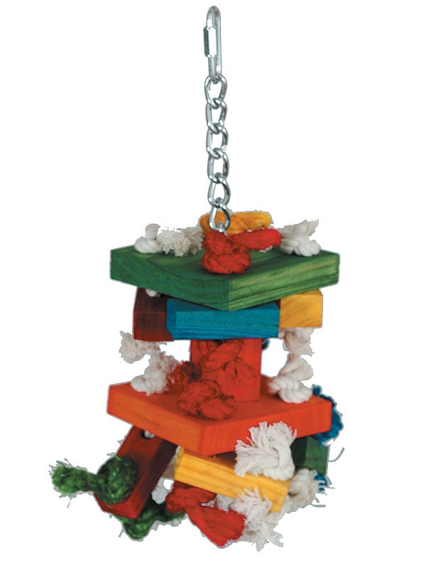 Το μικρό κυκλικό παιχνίδι Chew θα προσφέρει πολλές διασκεδαστικές ευκαιρίες για τα πουλιά. Τα διάφορα συστατικά του όπως οι ξύλινες πλάκες, οι μπάλες αμπέλου, ο πλαστικός δακτύλιος και οι στροφές φλοιού, όλα παρέχουν διαφορετικές υφές και επιφάνειες για τους φτερωτούς φίλους να σύρουν, να τραβήξουν και να μασήσουν. Πρσθέσαμε επίσης ένα κουδούνι στο κάτω μέρος για επιπλέον ηχητική διέγερση.