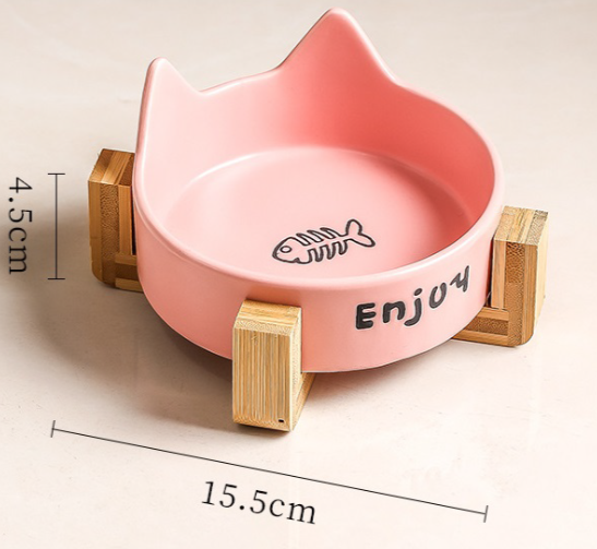 Κεραμικό Μπολ Γάτας Ροζ με Ξύλινη Βάση 15.5cm 200ml