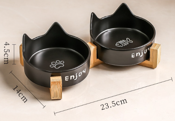 Κεραμικό Διπλό Μπολ Γάτας Μαύρο με Ξύλινη Βάση 15.5cm 200ml