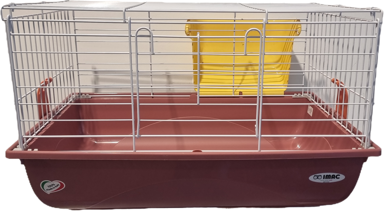 Metal cage with plastic base suitable for rabbits and guinea pigs.