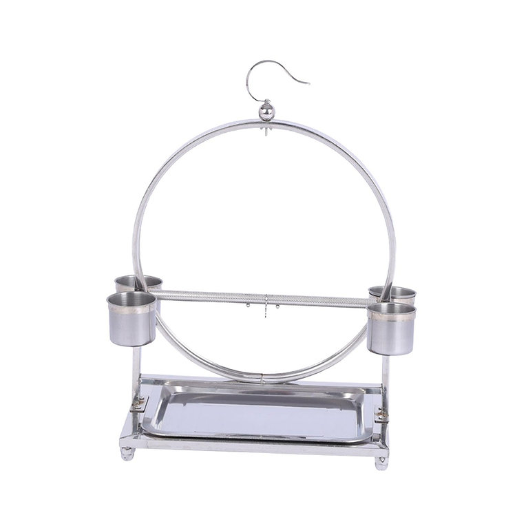 Stand for parrots. This luxurious stand is made of high quality stainless steel, which means no rust (even if we leave it outdoors in humidity and rain), no toxic paints, no peeling, easy cleaning. Absolute safety for our parrots as with classic stands made of iron there is a risk of poisoning our birds. The four stainless steel bowls of this bird feeder allow you to have water and food for your wonderful birds while they play. The metal tray under the bird play base makes cleaning and preparing for your next game easier. The footrest has a leash connection for safe outdoor use.
